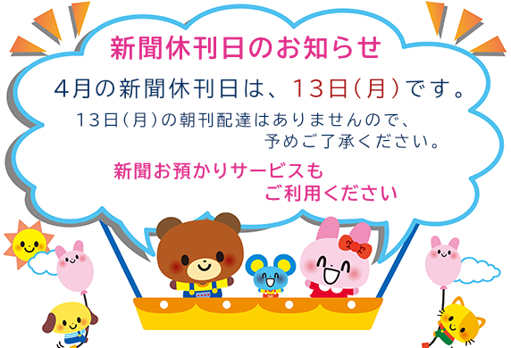 【休刊日のお知らせ】4月の新聞休刊日は、13日(月)です。13日(月)の朝刊配達はありませんので、予めご了承ください。